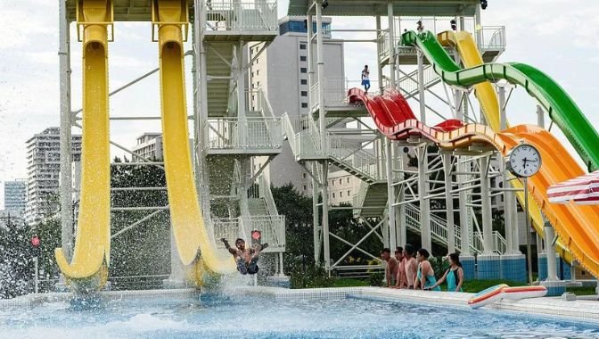 The Wonsan resort stretches across four kilometers of beachfront. It includes hotels, malls, restaurants, and a large water park, with a capacity of 20,000 visitors. North Korean leader Kim Jong Un hopes to grow tourism and generate foreign income through projects like this.
